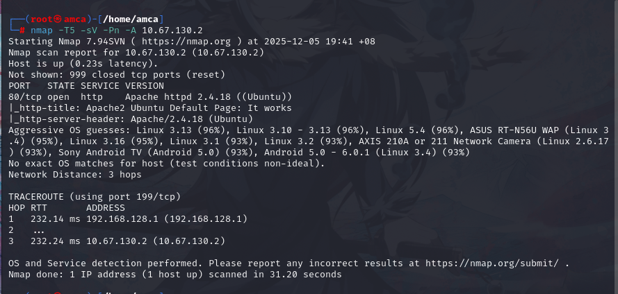 from the index page, we see default Apache Page with no further info, then let’s do further enumeraion with Gobuster, using this command